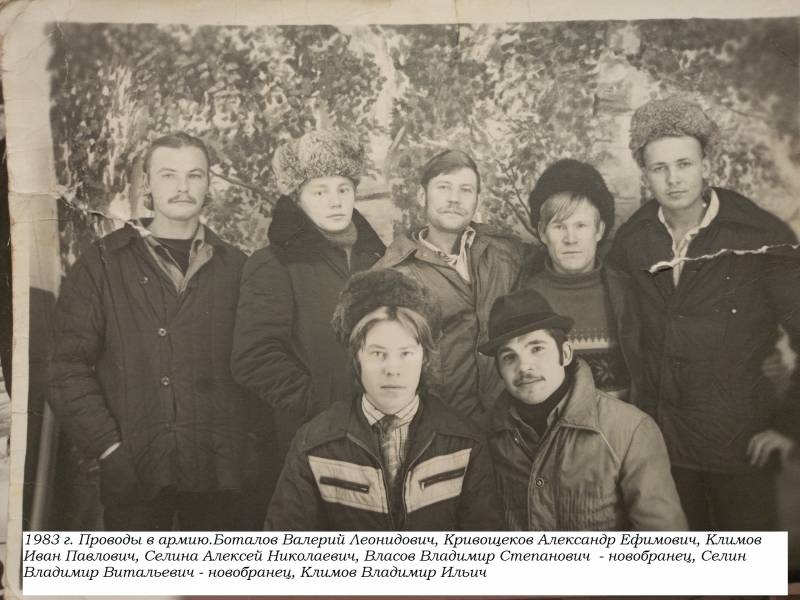 Кривощеков Виталий Владимирович, 2 ноября 1955 г.р., образование 8 классов (Ганёвская начальная и Архангельская восьмилетняя школы), заканчивает СПТУ№70 с.Юсьва, электрик в колхозе «Совет», женат, два сына.