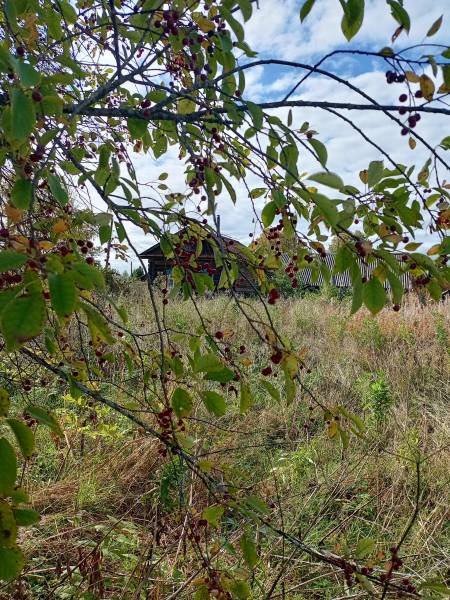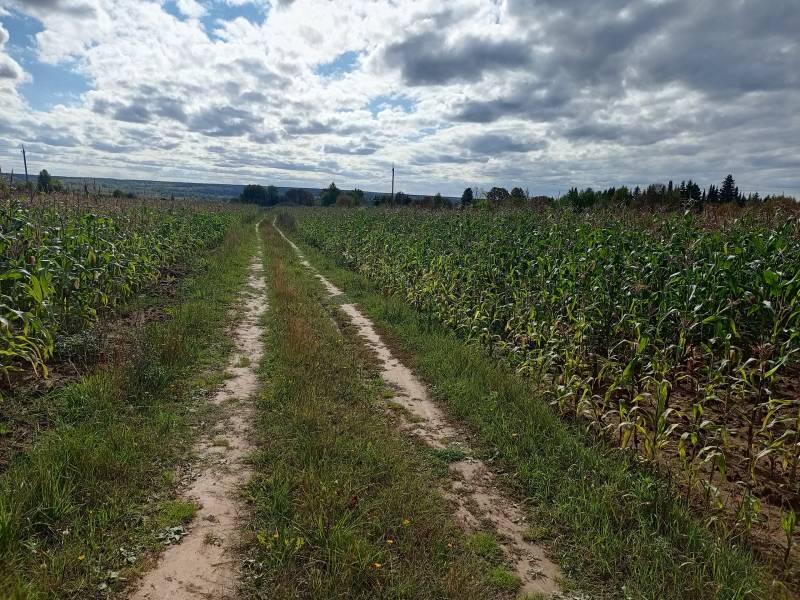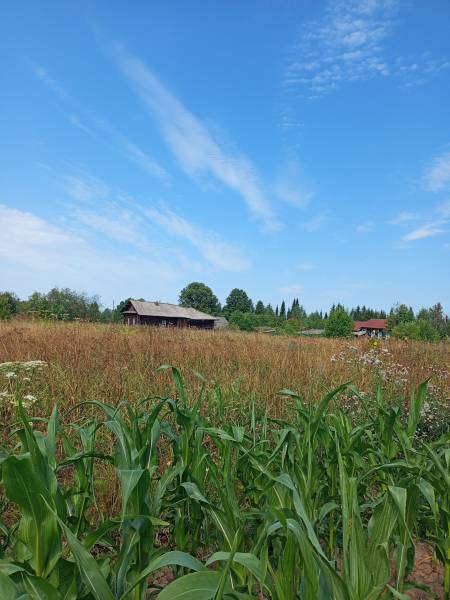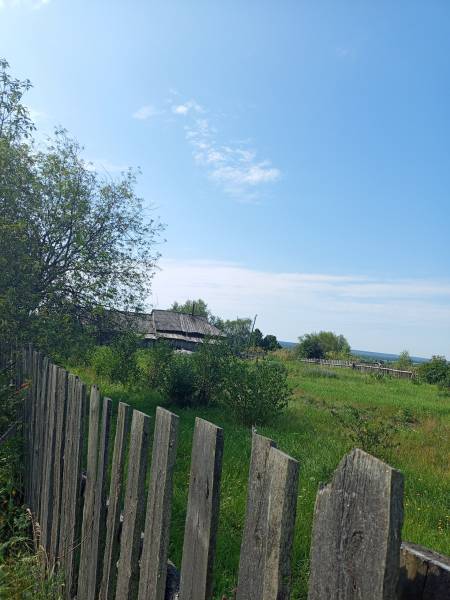 На этой фотографии в этом месте в деревне Пронино стоял магазин, где можно было купить все: соль, хлеб, канфеты, фрукты, ботинки, даже мебель. Вдали, за заросшими травами, наша родная речка Иньва. Рядом болото, куда ходили по весне собирать щавель, жимолость, а летом смородину красную и черную, черемуху, грибы, сенокосили вместе с родителями.